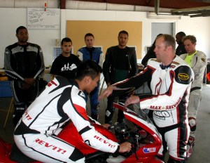 When classroom time is over, the students head to the garage and fire up their motorcycles. They line up on pit road and several students are assigned an instructor to follow on their first lap. This practice session lasts about 15 minutes, and is followed by another classroom session. They’ll alternate between riding and classroom time throughout the day. It’s literally painful to stand along pit road and watch the students hammer down the front straight; chills run down my spine as the heavy guttural exhaust note from Greenwood’s white Ducati Monster tears past me. The prospect of riding a motorcycle on a track as hard as prudence deems possible literally makes me salivate with excitement. As the day progresses, it’s fascinating to watch the students become more comfortable on the track. The mental demons have ceased their terrifying bombardment and are in full retreat: the students ride faster and faster, their bodies are more relaxed on the motorcycle, and their smiles continue to get wider.