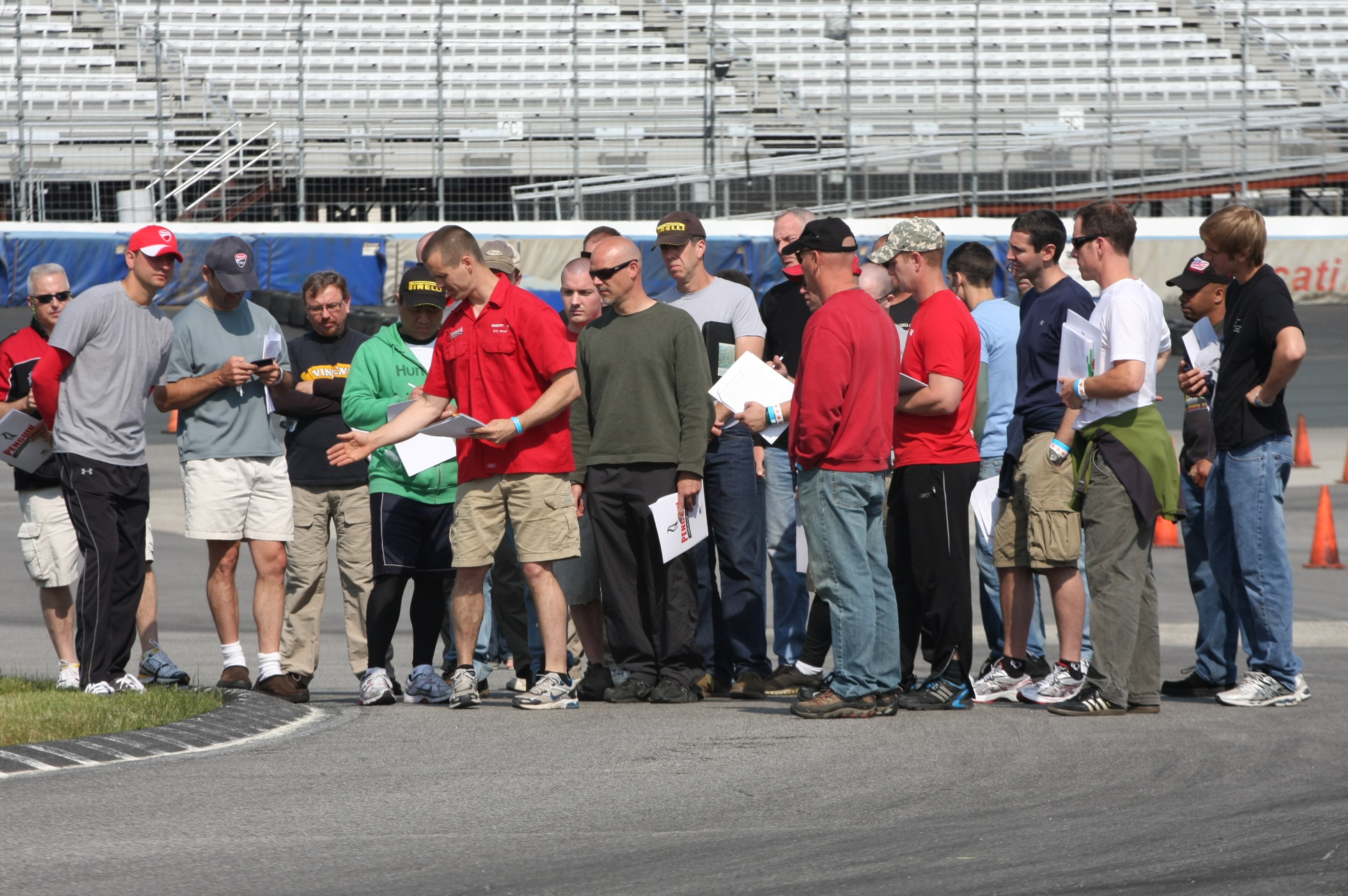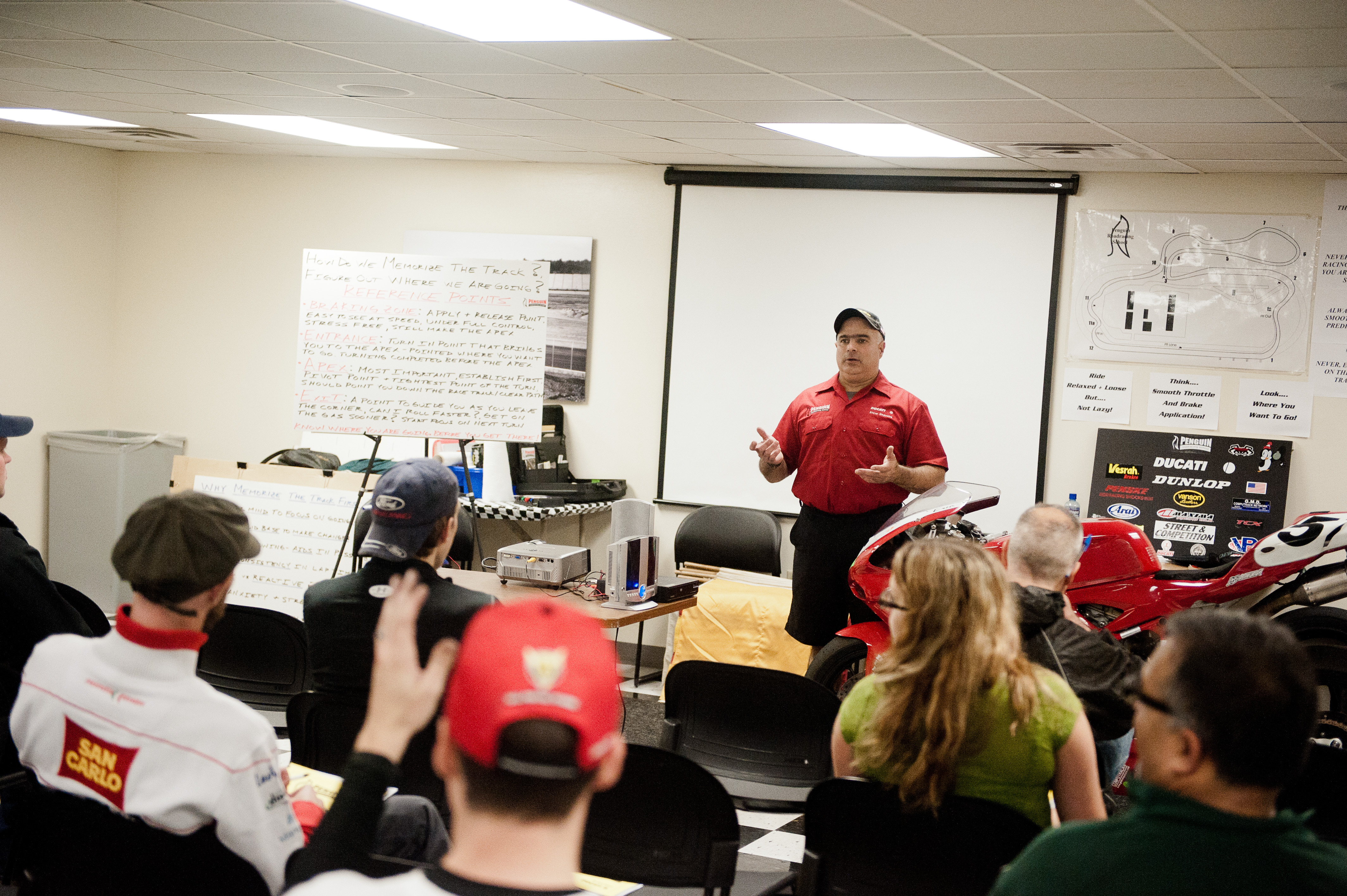 After a short briefing in the garage, the students and I immediately head into our respective classrooms. There are three classes going on today: the Basic course, the Advanced course, and the Track Day Experience course, of which I am a part. The Basic course is for riders looking to develop their racing skills and techniques, the Advanced course builds off the Basic course’s skills, and the introductory Track Day Experience course. We gather in the Media Room in the track’s infield, which is normally occupied by journalists during a NASCAR race. There are a mix of students here today: some experienced racers, a few older riders, and some who admit to having no track riding time at all. As the rain throws one particularly nasty tantrum, one of the students asks, “Does anyone have rain tires?”